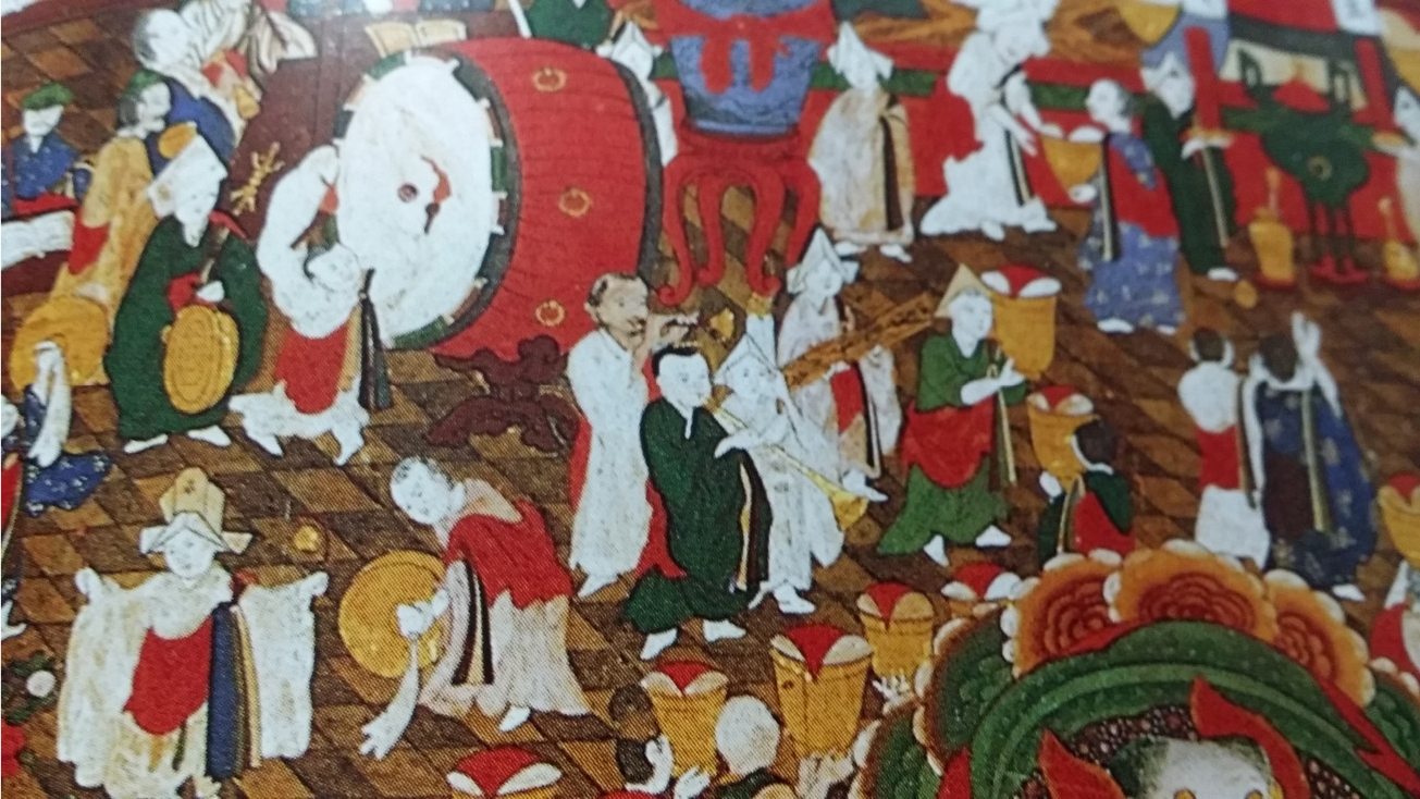 This essay looks at the musical performance characteristics and composition of samhoehyang (三回向), a performance that serves as a causal and entertaining social gathering following a large food-offering ritual within the context of gyeongje (京制) Buddhist music. The first part of samhoehyang, the hoehyang homily, is a traditional style of talk–singing with its own specific musical characteristics that, similar to pansori, combines both homily (narrative) and folk-style Buddhist chanting (sound), for the purpose of proselytizing Buddhist doctrine. Hoehyang homily appeals to the sensibilities of the masses in order to transmit Buddhist doctrine in an entertaining manner while enabling for the open expression of emotions and other content that had been difficult to express through food-offering rituals. Additionally, it appears that the next stage of the samhoehyang, the prayer and well-wishing stage (chugwondeokdam祝願德談), incorporated the traditions of both gosa (告祀) Buddhist chanting and hwacheong (和請) Buddhist chanting, indicating that folk-style chanting was actively used within this ritual. That is, samhoehyang utilized (folk-style) Buddhist chanting practices that reflected the musical tastes of the masses and their needs. In this way, it effectively transmitted the teachings of the Buddha. In the third stage, which is the dancing stage, participants performed lively and exciting Buddhist dances and other dances that in some way conformed to a Buddhist worldview. The accompanying music also aligned with popular taste, providing participants with a rousing experience that expressed the joy and gratitude for the large food-offering ritual. The fourth stage, the japui (雜戲) stage, is the highlight of samhoehyang; all of the attendees participate, and it offers an enjoyable release through music following the difficult work of the food-offering ritual. The musical particularity of this performance is that it centers on popular folk music, indicating that the folk performances of Korean mask dances, which continue to be passed down to this day, were formerly performed at temples as a part of samhoehyang. In the final stage of the samhoehyang, the gathering comes to a calm conclusion through the acts of pagoda-circling (tapdori탑돌이) as a means of making prayers for wishes and reciting a transfer of merit (hoehyang). Moreover, it appears that pagoda-circling involved the combination of both folk songs (the Gyeonggi folk song “Tapdori”) and Buddhist chanting. In this way, it offers a glimpse into the essence of Buddhist folk games that included the common people. This paper confirms that samhoehyang, which belongs to gyeonje-style Buddhist music, was a Buddhist folk game that offered a fun and exciting social gathering that included common folk following a large food-offering ritual. Moreover, when considering the overall musical characteristics of samhoehyang, the first stage functions as a beginning via talk–singing. The second and third stages, which are the prayer and well-wishing stage and the dancing stages, respectively, bring excitement to the performance. The fourth stage, the japui stage, is the climax of the event, and the fifth stage, the transfer of merit stage, offers a conclusion. In this way, its composition has a beginning, a development, and an ending. Gyeongje-style samhoehyang is of great significance, as it capture the history of Buddhist folk games from the kiak (伎樂) of the Three Kingdoms period to the sandae japui (山臺雜戲) of Goryeo and the samhoehyang of the Choseon dynasty.